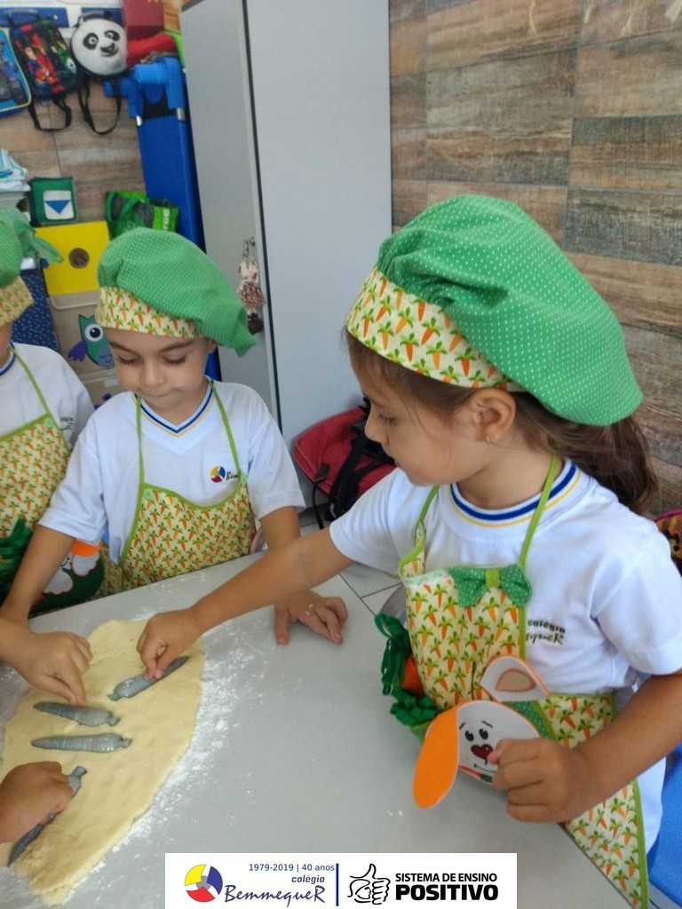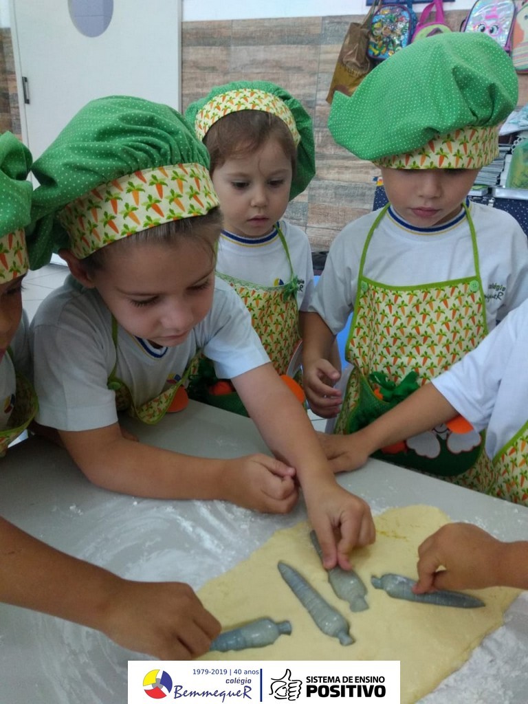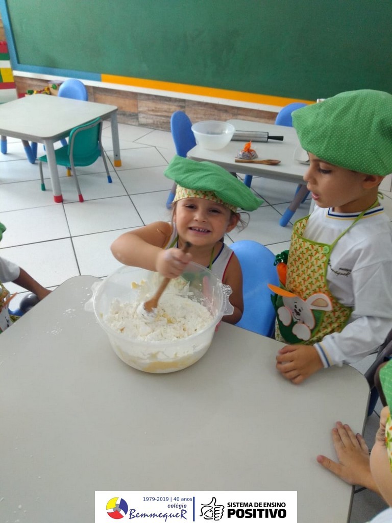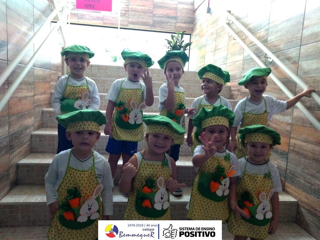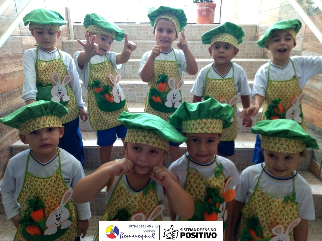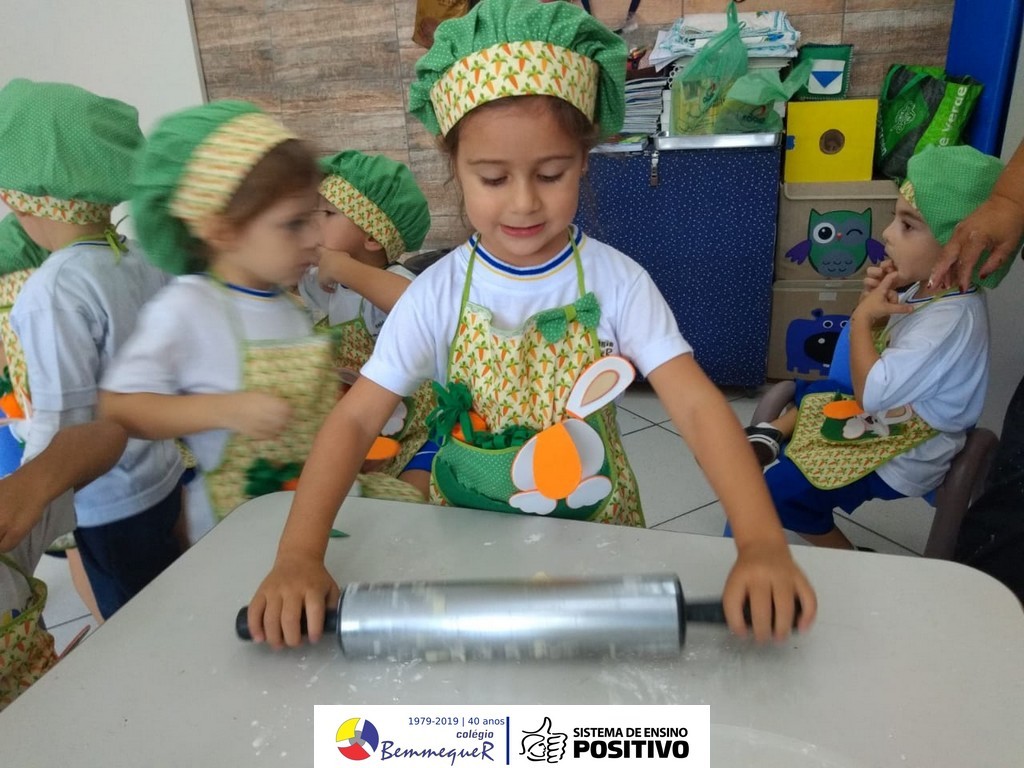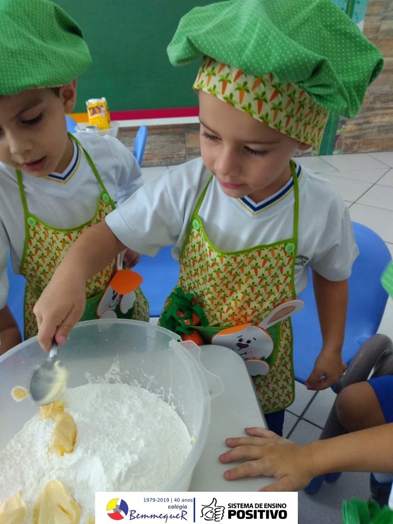 Os alunos do Grupo 3 tiverem uma aula de culinária divertida para comemorar a Páscoa, onde foram feitos biscoitos deliciosos em formato de cenoura pelos Masters Chefs mais fofos.