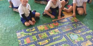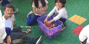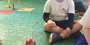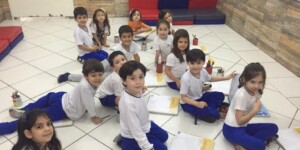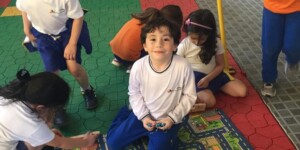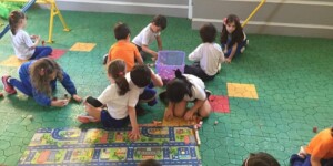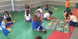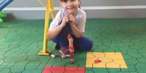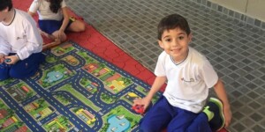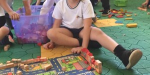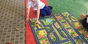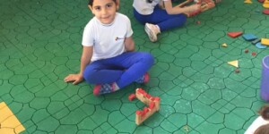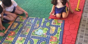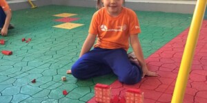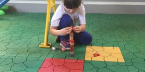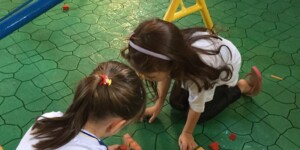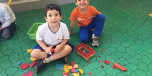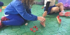 Nesta brincadeira os alunos utilizaram blocos de construção para fazer de conta que são gigantes, como na história “O Gigante Egoísta”, como estudaram na apostila.