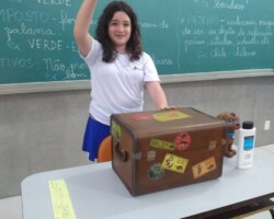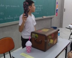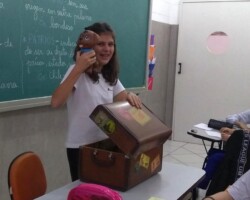 Apresentei à classe alguns objetos que foram colocados numa caixa surpresa. Divididos em grupos, em 1 minuto e meio, os alunos tinham que listar o maior número possível de adjetivos para cada um deles.
