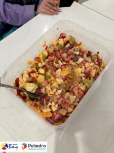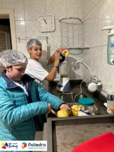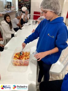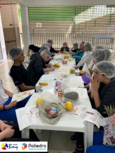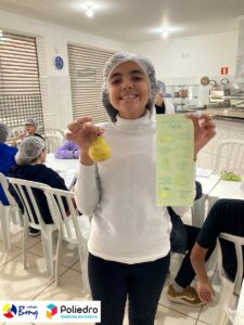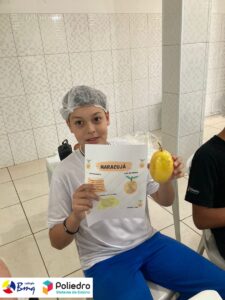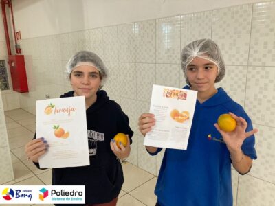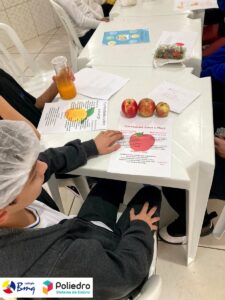 Os alunos do 7º ano trabalharam com o gênero infográfico. Eles conheceram a estrutura, finalidade e características na aula expositiva de produção textual. Após essa etapa, eles desenvolveram um infográfico sobre os benefícios das frutas e, para tornar a aula mais lúdica e diferente, eles trouxeram a fruta pesquisada e apresentaram para a turma. Depois disso, colocamos a mão na massa, melhor, na fruta e fizemos uma deliciosa salada de frutas e sucos.