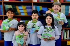 Colocamos lixo espalhado no corredor da entrada, para ver a reação e atitude das crianças. As que recolheram e jogaram no lixo, aparecem na foto. Sophia (G5), Miguel (3º ano), Gabriela (3º ano), Rafael S. (4º ano) e Enzo (5º ano).