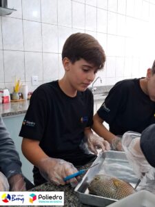 Os estudantes puderam observar de perto as características que permitem aos peixes viver na água, como a forma hidrodinâmica do corpo, a função das nadadeiras e, o mais fascinante, o mecanismo da respiração branquial. Profº Diego guiou a turma na identificação de diferentes tipos de escamas e na observação da linha lateral, despertando a curiosidade dos jovens cientistas sobre como os peixes se orientam e sobrevivem em seu ambiente. Foi uma aula dinâmica que transformou o conhecimento teórico em uma experiência real e concreta.