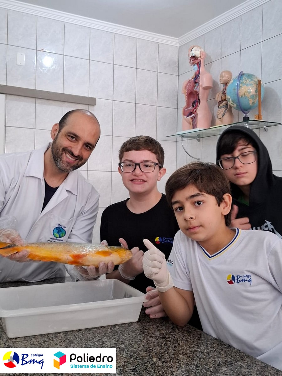 Os estudantes puderam observar de perto as características que permitem aos peixes viver na água, como a forma hidrodinâmica do corpo, a função das nadadeiras e, o mais fascinante, o mecanismo da respiração branquial. Profº Diego guiou a turma na identificação de diferentes tipos de escamas e na observação da linha lateral, despertando a curiosidade dos jovens cientistas sobre como os peixes se orientam e sobrevivem em seu ambiente. Foi uma aula dinâmica que transformou o conhecimento teórico em uma experiência real e concreta.