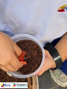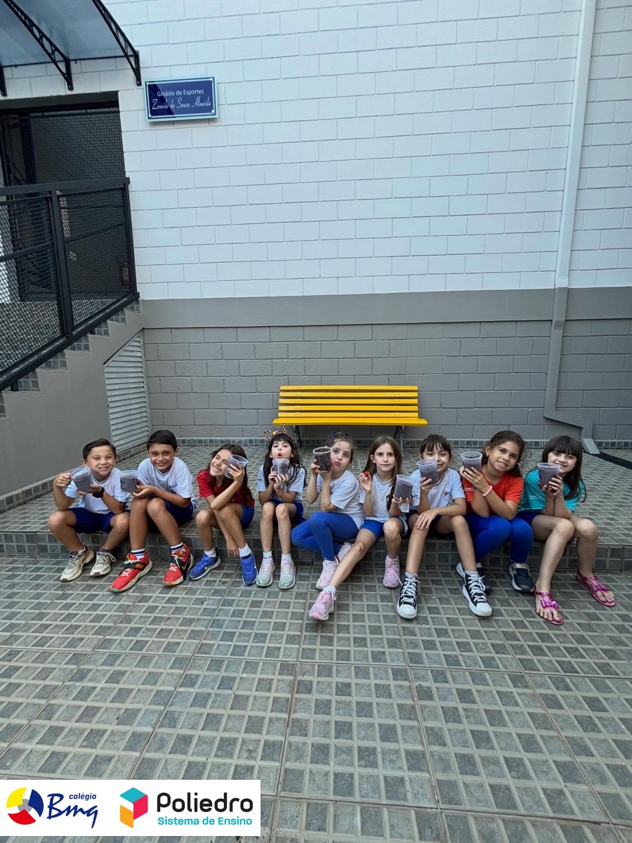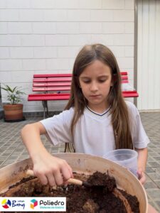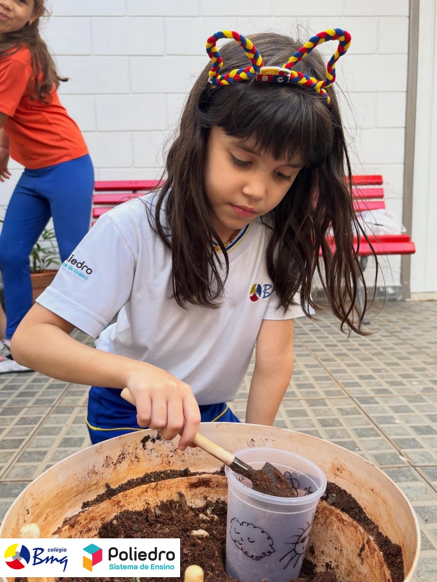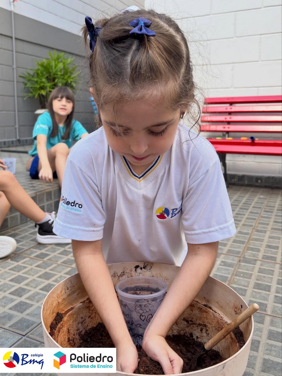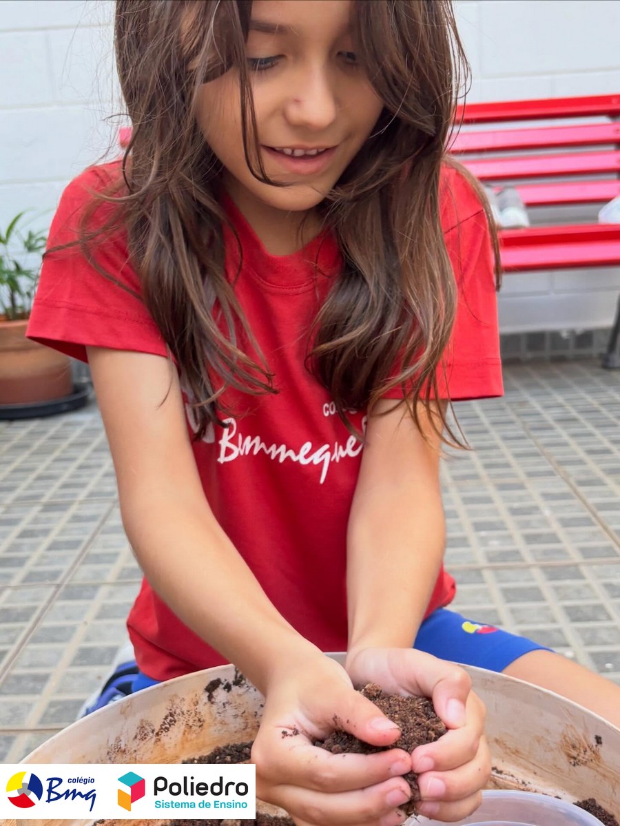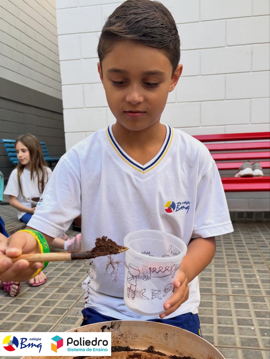 Durante a atividade, aprendemos que tudo começa com a semente e que, com água, luz do sol e nutrientes, a planta passa por várias etapas até crescer forte e saudável, como a germinação, o surgimento das raízes, do caule e das folhas.