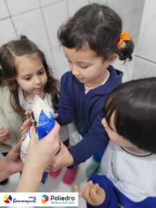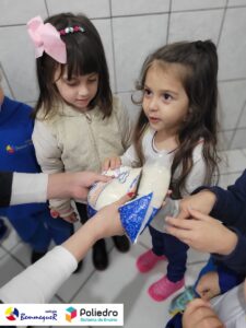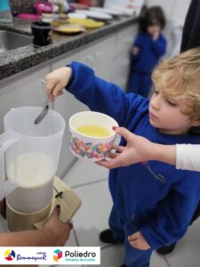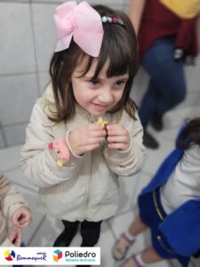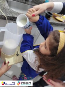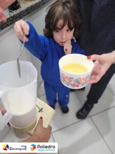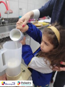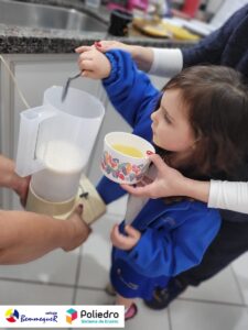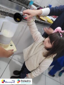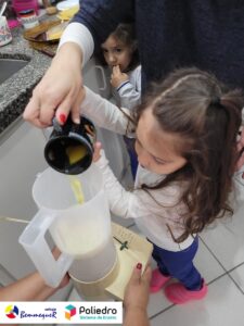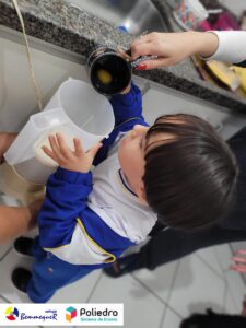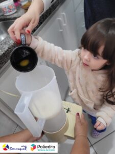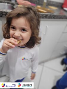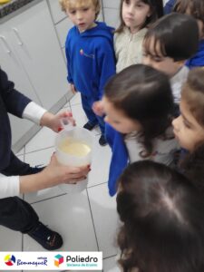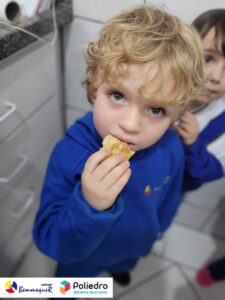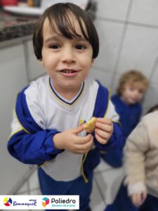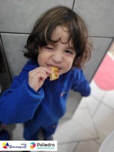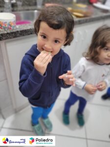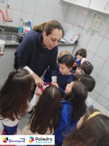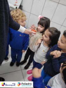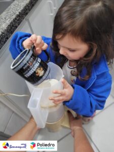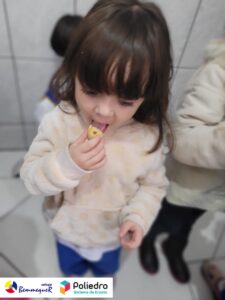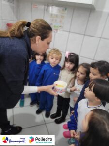 Eles se deliciaram, participaram, colaboraram e realizaram a atividade proposta, em equipe. Aguçando assim, os cinco sentidos, reforçando também o conhecimento com quantidades.