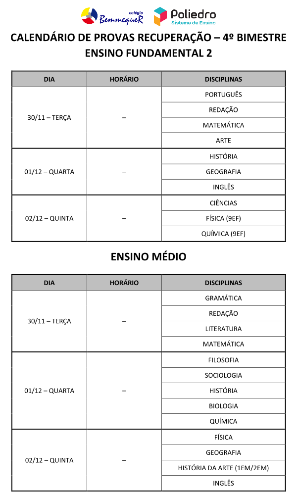 Provas Recuperação – 4º Bimestre – EF2 e EM